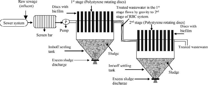 Rotating biological contactors (RBC), also called rotating biological filters, are fixed-bed reactors consisting of stacks of rotating disks mounted on a horizontal shaft. They are partially submerged and rotated as wastewater flows through. They are used in conventional wastewater treatment plants as a secondary treatment after primary sedimentation of domestic grey- or blackwater, or any other biodegradable effluent. The microbial community is alternately exposed to the atmosphere and the wastewater, allowing both aeration and assimilation of dissolved organic pollutants and nutrients for their degradation.